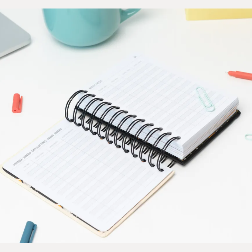 Agenda anual de 12 meses de janeiro a dezembro 2026 dia página. Mede 11,4 x 16 cm. Inclui capa rígida de 1,5 mm forrada em papel de 125 g/m2, encadernação tipo wire-o com banda elástica, interior genérico às riscas, 8 folhas separadoras, 16 ilustrações, 2 páginas de autocolantes genéricos, bolso interior e faixa destacável com marcadores de páginas e régua no verso. Contém 348 páginas de 100 g/m2. Idiomas: inglês, espanhol, francês, italiano e português.