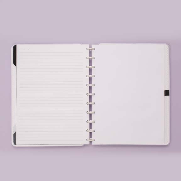 Este caderno Lilás Pastel é composto por uma capa e contracapa rígidas; uma bolsa plástica (184 x 274 mm); uma folha de instrução de uso com recargas e acessórios da marca disponíveis no verso; uma folha de identificação com calendário no verso; quatro divisórias com abas para identificação (2 pretas e 2 transparentes); 80 folhas offset de 90g (60 folhas pautadas e 20 folhas lisas brancas para impressão); um suporte com elástico para caneta ou lápis; e discos M + elástico.