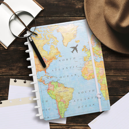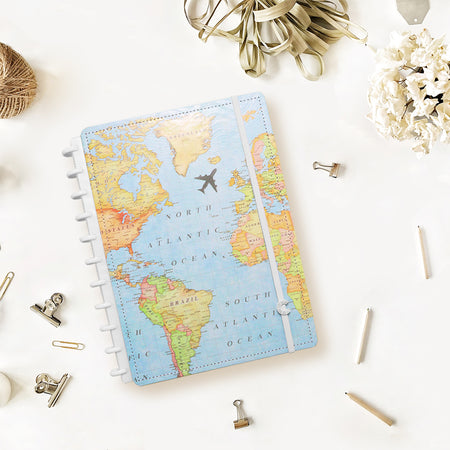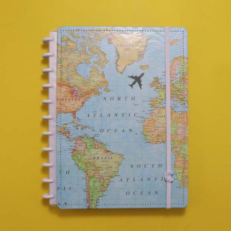 O caderno que tiras e colocas as capas e as folhas quando quiseres! O Caderno Inteligente Mapa Mundi, coleção da Gocase, tem dois formatos: Grande e A5.