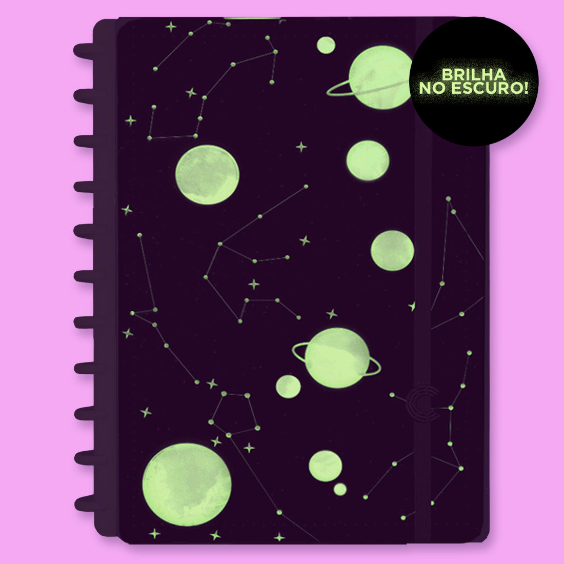 O Caderno Inteligente Purple Galaxy está repleta de constelações e planetas que, na ausência de luz, brilham no escuro, graças ao acabamento fotoluminescente.