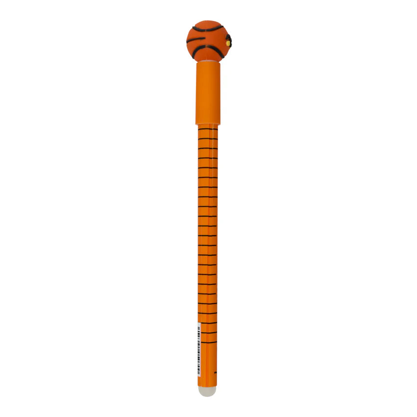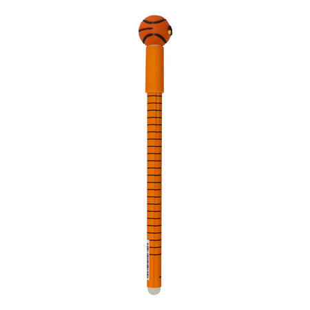 Caneta com tinta apagável laranja e a bola de basquete do Ernesto em uma ponta.
