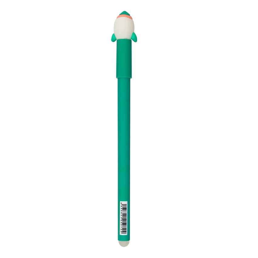 Caneta com tinta azul apagável e o foguete Arlete em uma ponta.