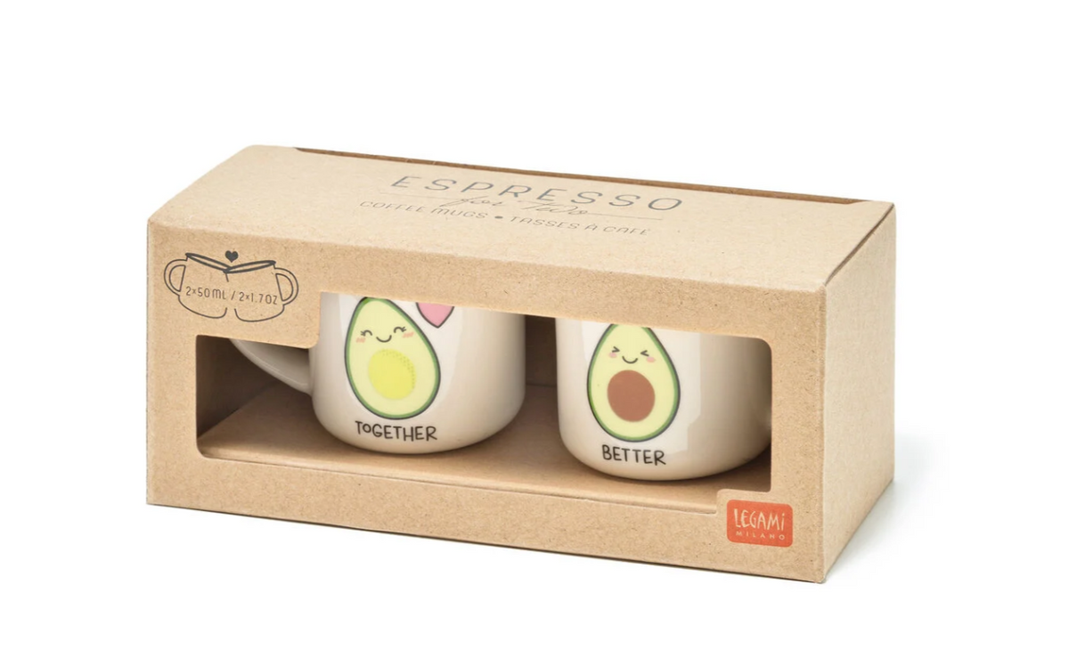 Torne as suas manhãs ainda mais doces com as canecas de café Legami Espresso For Two - Abacate, feitas em porcelana New Bone China. Este par de canecas de 50 ml complementa-se na perfeição, sendo a forma ideal de expressar os seus sentimentos à sua pessoa amada.