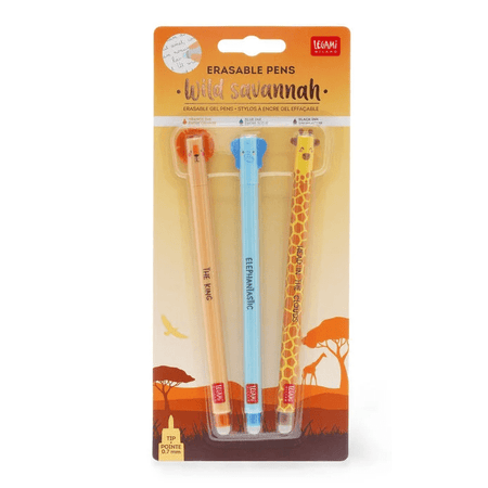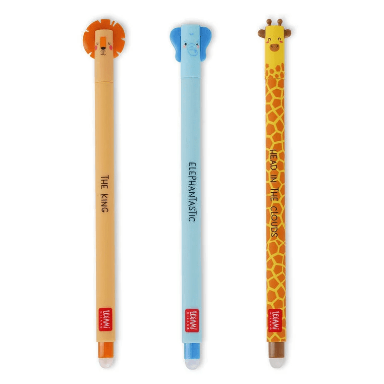 Esteja preparado para qualquer erro com um conjunto de 3 canetas de gel apagáveis Savannah Lion, Elephant e Giraffe da Legami, com tinta laranja, azul e preta. Escreva e rabisque à vontade, apagando quando necessário, pois com a tinta termossensível não terá de deitar a página inteira fora. As árvores vão agradecer!