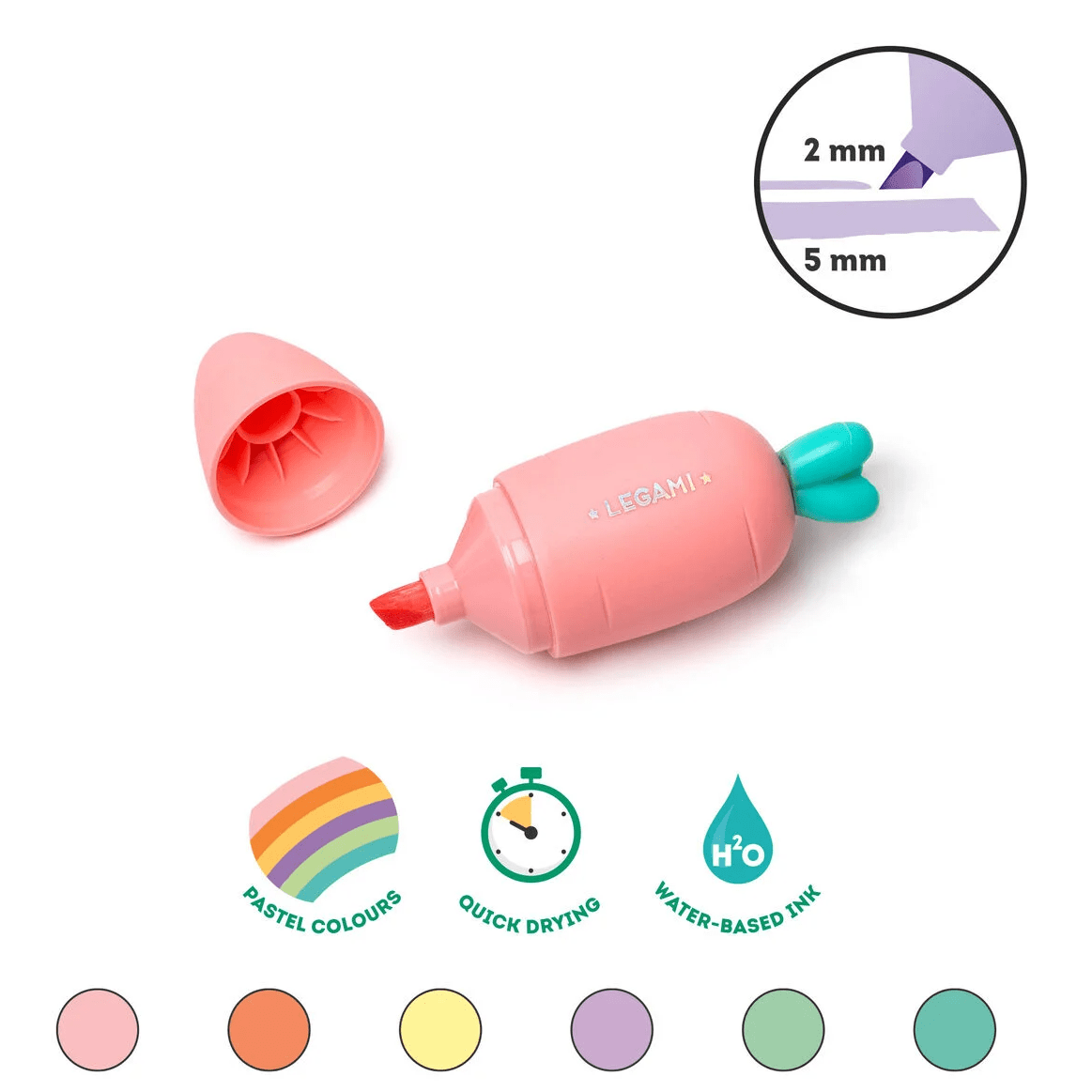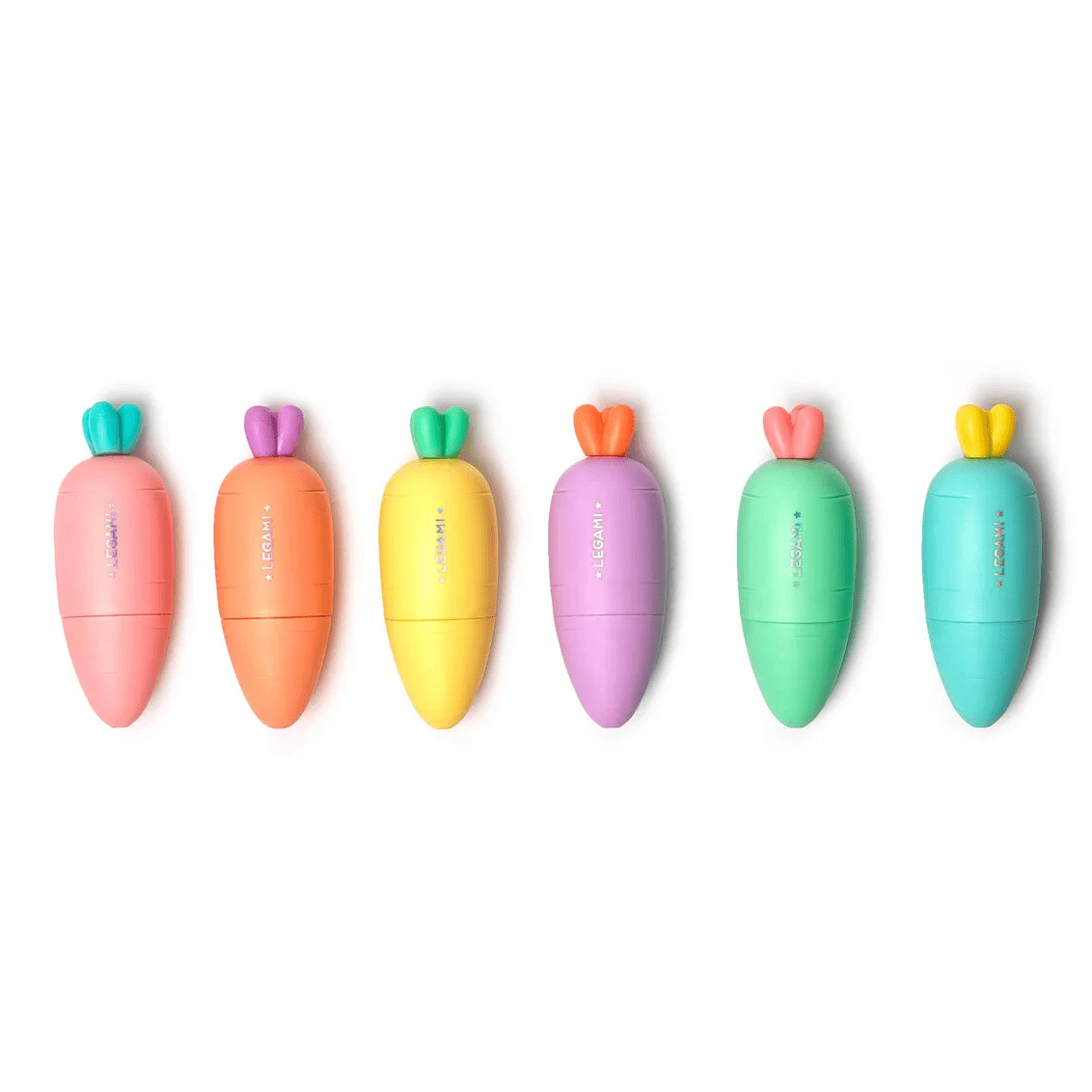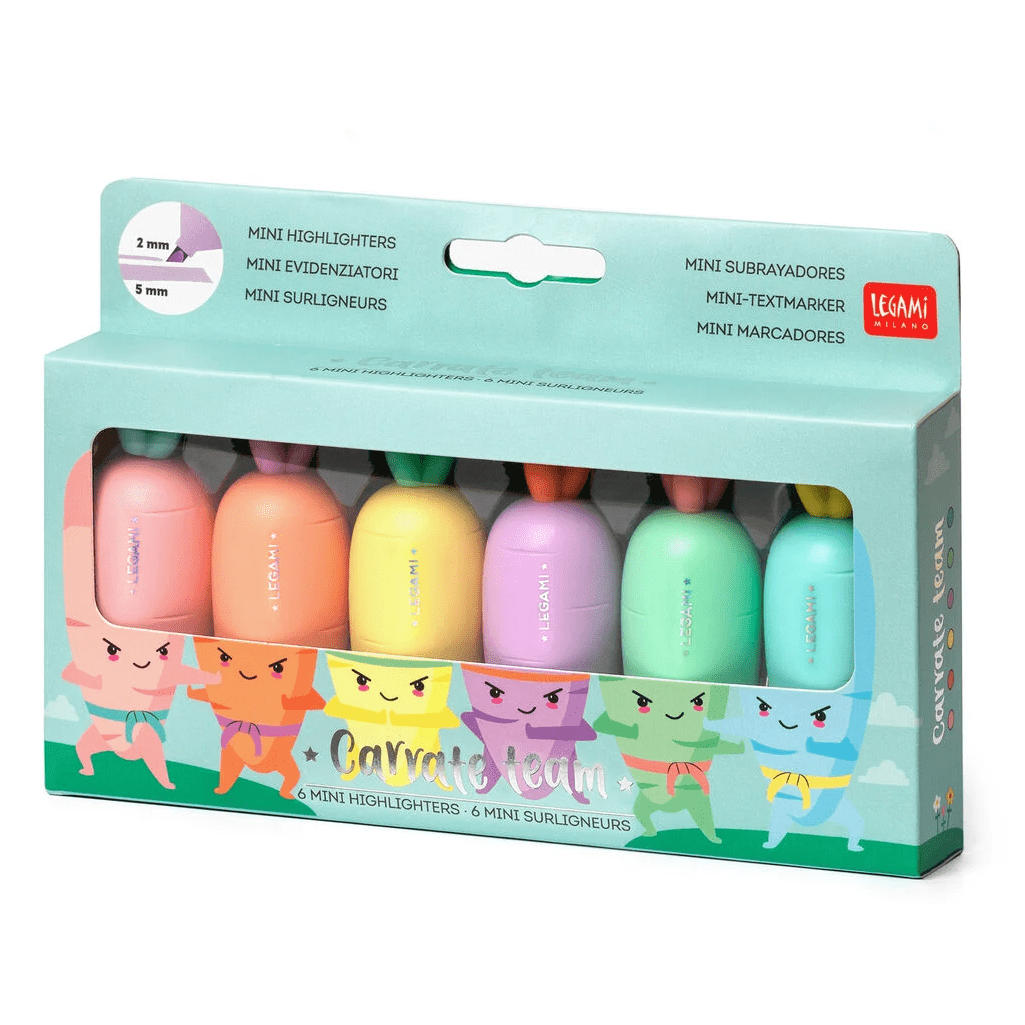O conjunto Carrate Team de 6 mini marcadores em forma de cenoura irá dar cor aos seus livros e cadernos com tintas brilhantes à base de água.