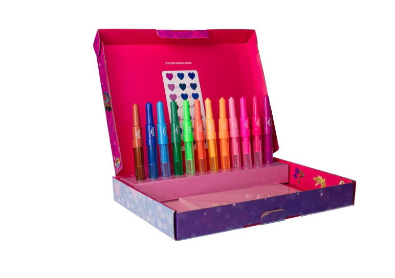 Conjunto de atividades para criar lindas obras de arte das princesas com canetas spray. Inclui 16 desenhos das princesas e seus Amigos Incríveis, 12 canetas spray, um porta-canetas e 16 folhas em branco. Não adequado para crianças menores de 3 anos.