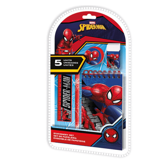 El juego incluye un cuaderno con el tema de Spider-Man, perfecto para tomar notas o garabatear. También incluye bolígrafo, lápiz y goma de borrar, todo ello adornado con el famoso logo de Spider-Man. El conjunto se completa con una regla y un estuche, ambos con diseños vibrantes y llamativos de Spider-Man.