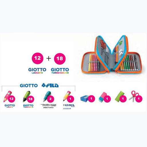 Estojo com três compartimentos em tecido colorido e zíper que abre em direções alternadas. Inclui todo o material escolar necessário: 12 lápis de cera Giotto, 18 marcadores Giotto Turbo Color, 2 canetas Fila Uno, 1 lápis Lyra, 1 Afia, 1 borracha, 1 régua e 1 tesoura.