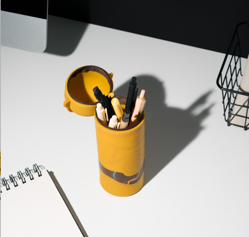 Estojo 3D fabricado em silicone. Possui fecho de correr e puxador personalizado. A sua parte inferior é extensível, o que permite aumentar tanto o seu tamanho como a sua capacidade. Medidas: 7 x 21 cm aproximadamente.