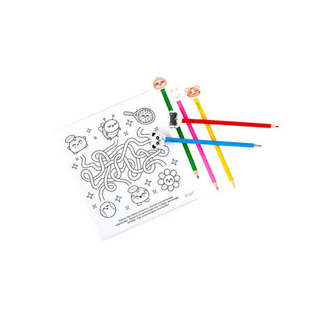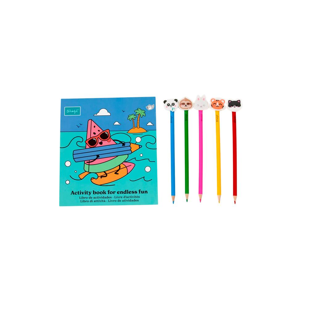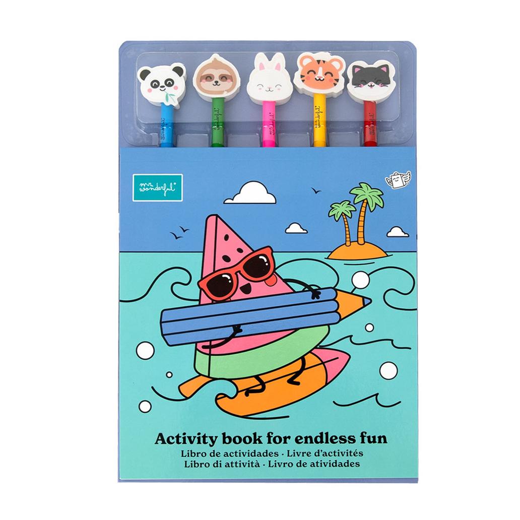 O conjunto inclui ainda 5 lápis de cor, cada um com uma borracha divertida em forma de personagens Mr. Wonderful, tornando a experiência ainda mais apelativa e prática para as crianças.