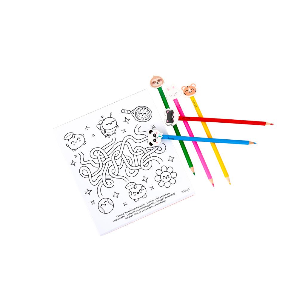 Inclui 5 lápis de cor com borrachas em forma de personagens