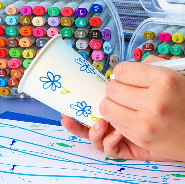 As 60 cores vibrantes e altamente pigmentadas são resistentes à luz e ao sol, oferecendo uma aplicação suave e uniforme. São permanentes em quase qualquer superfície, incluindo papel, tecido, madeira e plástico, tornando-os extremamente versáteis para diferentes projetos criativos.