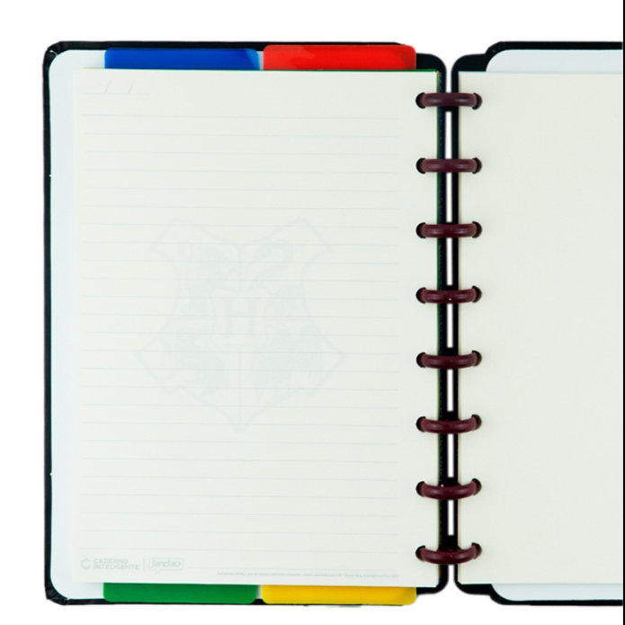 O caderno que tiras e colocas as capas e as folhas quando quiseres! O Caderno Inteligente black do Harry Potter, tem dois formatos: Grande e A5.