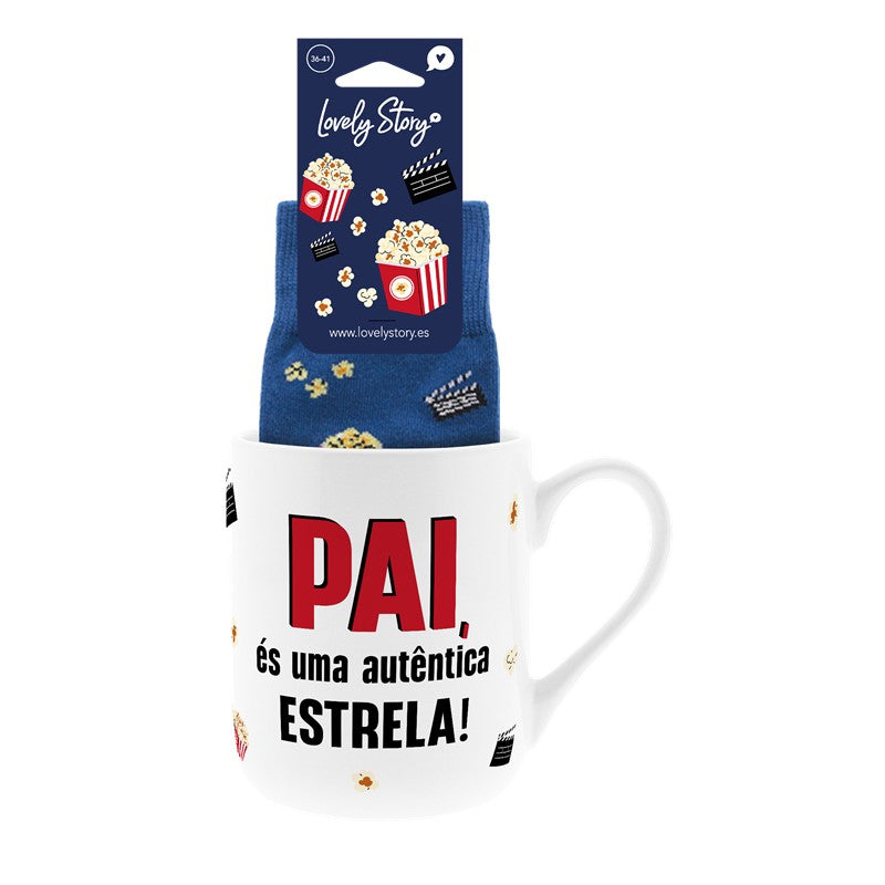 Composto por uma caneca e um par de meias com design inspirado no universo do cinema, este conjunto celebra o verdadeiro protagonista lá de casa.