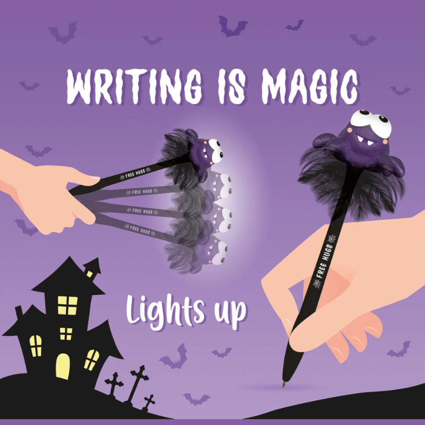 Pum pum pum... É um monstro a bater à porta? Não, é apenas a Caneta de Gel Aranha Iluminada - Escrever é Mágico da Legami, batendo na mesa e acendendo como que por magia. Perfeita para fotos assustadoras e cumprimentos assustadores!