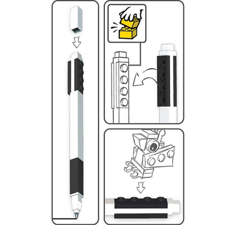 O mini boneco LEGO vermelho no topo é removível e compatível com peças LEGO, permitindo personalizar a caneta ao teu gosto. Um acessório original que combina diversão e funcionalidade, ideal para fãs LEGO de todas as idades.