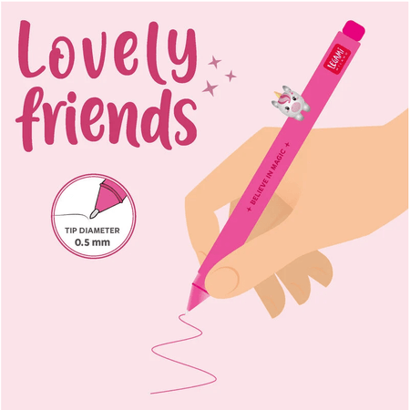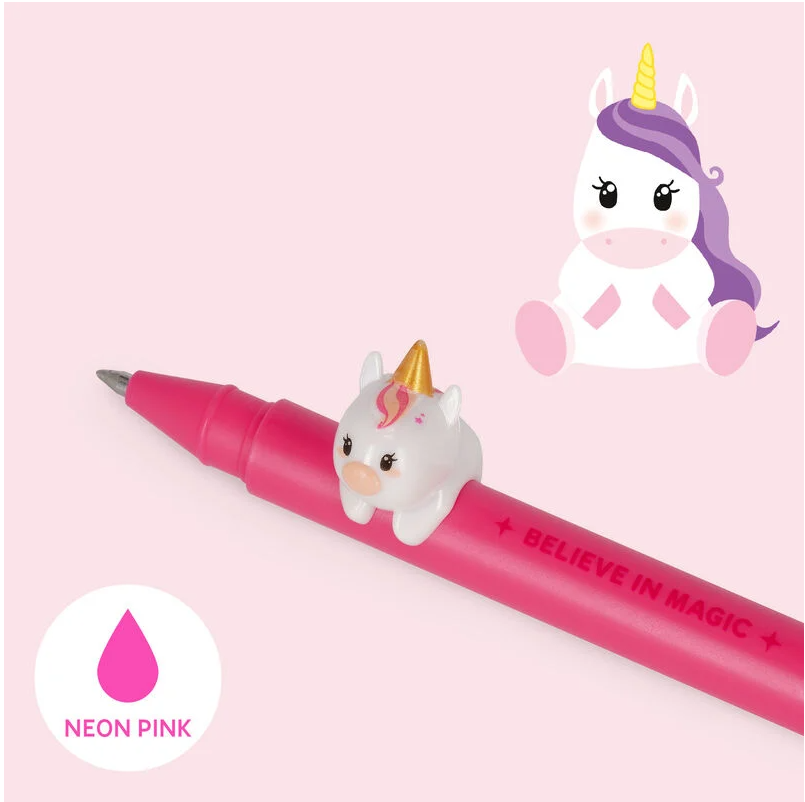 Com a Caneta Gel Unicórnio decorativa Legami da família Lovely Friends, está sempre em boa companhia. O seu amigo panda não só deixa todos os dias super fofos, como também cuida da sua caneta onde quer que a deixe, para que não role.