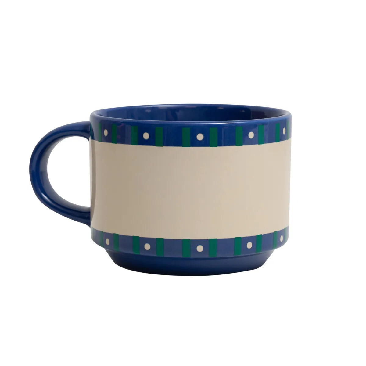 Conjunto de duas canecas em cerâmica, cujo molde permite guardá-las empilhadas, uma sobre a outra.