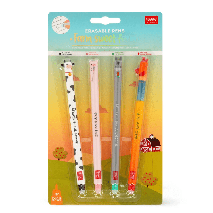 🐮🚜🖊️ Conjunto de 4 Canetas Apagáveis Quinta (Farm) Legami – Diversão, cor e praticidade num só pack!