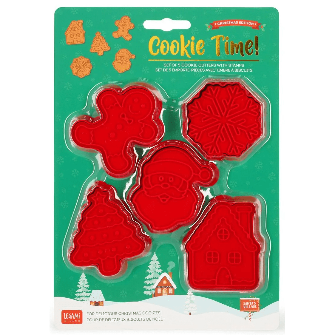 É sempre hora de biscoitos! Está pronta para alguns bolos de Natal, com o Conjunto Legami de 5 Cortadores de Bolachas com Selos - Hora das Bolachas? Os 5 formatos diferentes de carimbos são perfeitos para decorar a sua massa e polvilhar um pouco do espírito natalício nos seus dias.