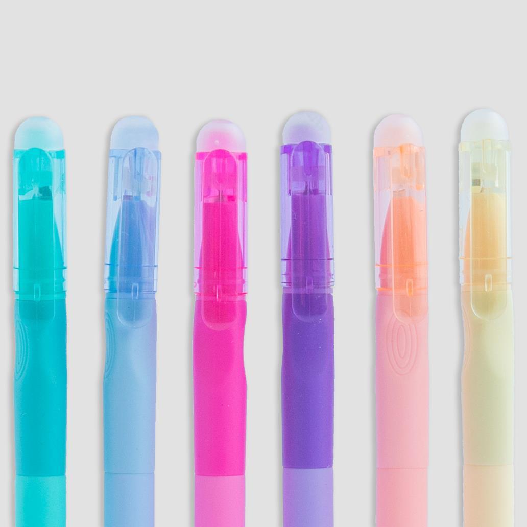 Kit de 6 canetas de apagar de cores, em estojo de plástico transparente.