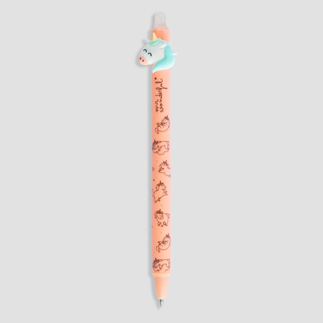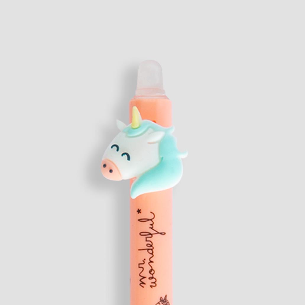 Esferográfica com tinta apagável, que apresenta o Unicórnio Mr. Wonderful na extremidade.