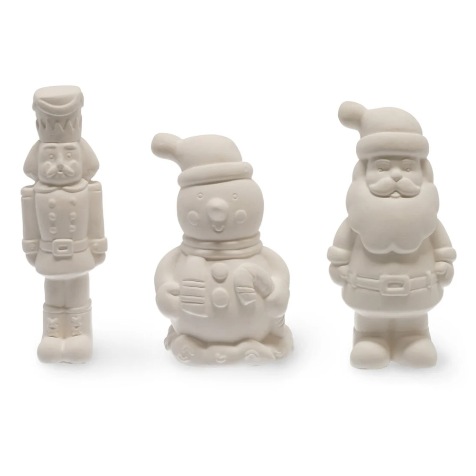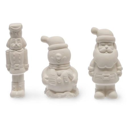 Contém: 3 figuras em gesso (quebra-nozes, boneco de neve, Pai Natal); tintas têmpera em 7 cores; 1 pincel