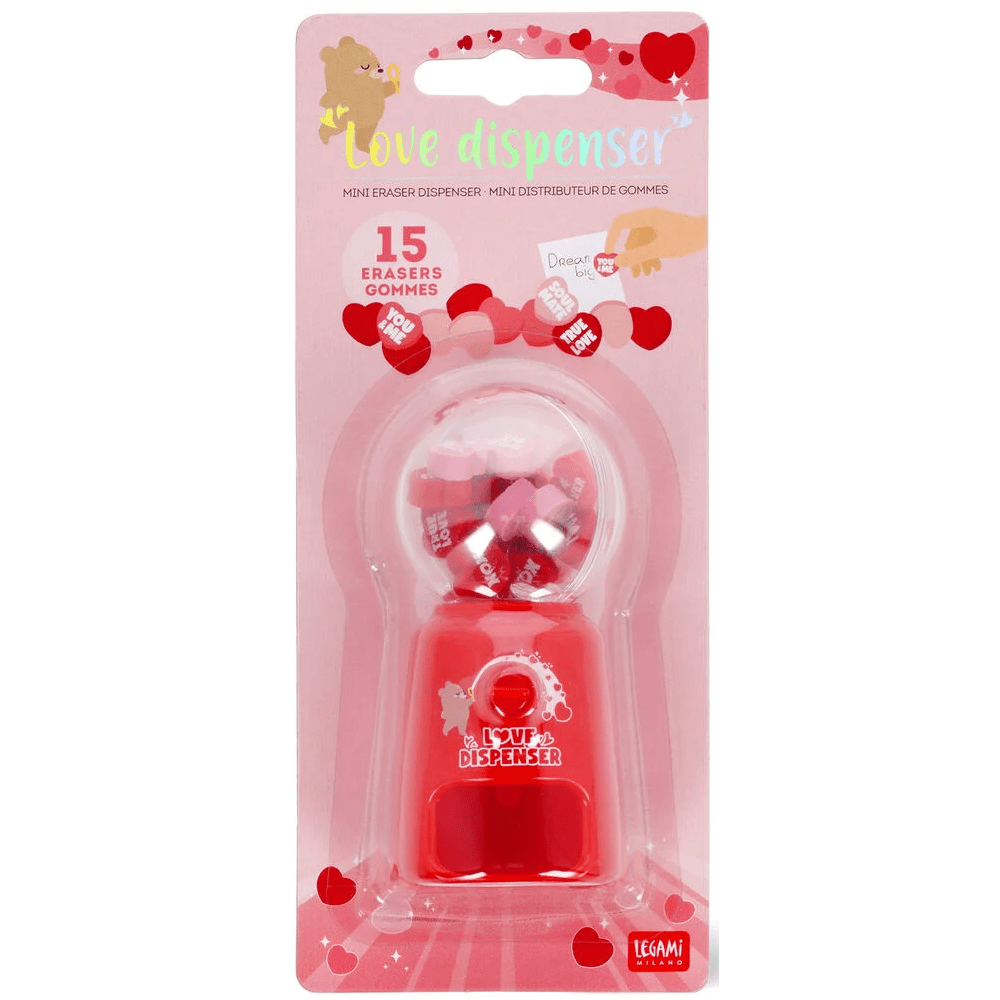 Acha impossível apagar mágoas antigas, o nome de uma antiga paixão ou o número de telefone de um ex? Experimente o Mini Dispensador de Borracha da Legami - Love Dispenser! Mantenha-o na sua secretária: basta rodar a maçaneta para receber uma mensagem de amor e uma borracha em forma de coração para apagar erros, pelo menos do seu diário.