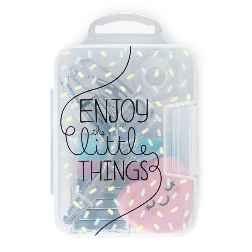 Desfrute das pequenas coisas com o Mini Conjunto de Papelaria Legami. Dentro da caixa transparente estão 6 mini acessórios incluindo tesoura, marcador, marcadores de livros, fita adesiva com dispensador, bem como agrafador e agrafos. Tudo o que precisa de levar consigo, de casa para a biblioteca ou para a escola, para o trabalho e para onde quer que a vida o leve.