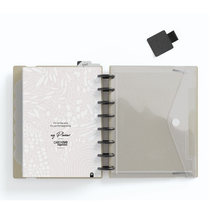Com capa em PP impressas frente e verso, 8 discos de 36mm para maior capacidade e fecho em borracha. . O interior inclui: planeamento semanal de 14 meses, folhas de organização semanal, folhas de rastreador de hábitos, folhas de planeamento anual, folha de notas, papel para escrever 92 páginas (pontos, predots e papel carta + calendários 2022/23/24, régua de 20cm, vidro envelope em PP com fecho adesivo, porta canetas, 6 divisórias transparentes e 134 autocolantes